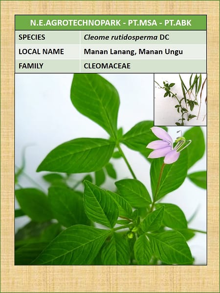 - Deskripsi: Cleome rutidosperma adalah tanaman tahunan yang dapat tumbuh hingga setinggi 30-60 cm. Batangnya tegak dan bercabang, dengan daun berwarna hijau berbentuk lonjong dan tersusun dalam roset basal. Bunga-bunganya berwarna ungu kebiruan dan berbentuk khas dengan empat kelopak.